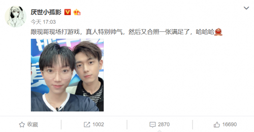 活动结束后,孤影晒出和李现的合照,夸李现特别帅气。惹得“现女友”纷纷到孤影微博下表示感谢,而孤影粉丝也刷屏李现和孤影同框都不知道该羡慕谁了。