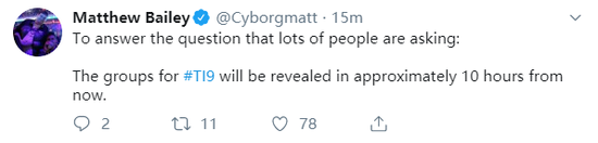 在战队入住酒店完毕之后,除了定妆照的拍摄之外,各战队还会派出人选进行TI9小组赛的分组抽签,目前官方并未公布任何与小组赛分组有关的消息,抽签过程是否有直播也尚未得知。但秘密战队的经理还是一如既往地造福玩家,透露了他得到的内部消息——小组赛分组将在大约10小时内公布。