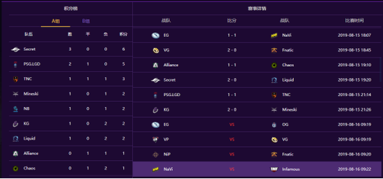 VG共有两个BO2的比赛,第一轮是与RNG的同区对战,双方都展现了精湛的技术,但VG更胜一筹,成功拿下首胜。第二轮面对东南亚赛区的Fnatic战队,VG也是轻松的以2-0的比分拿下对手。首日比赛结束,VG排名B组第一。其他中国战队也是表现精彩,其中LGD(2胜1平0负)、RNG(0胜1平1负)、KG(1胜0平2负)。