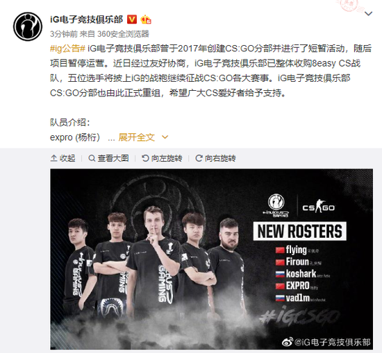 IG电竞竞技俱乐部刚刚正式宣布再次回归CSGO,并签下了8easy战队5名选手,以下为IG官博原文:
