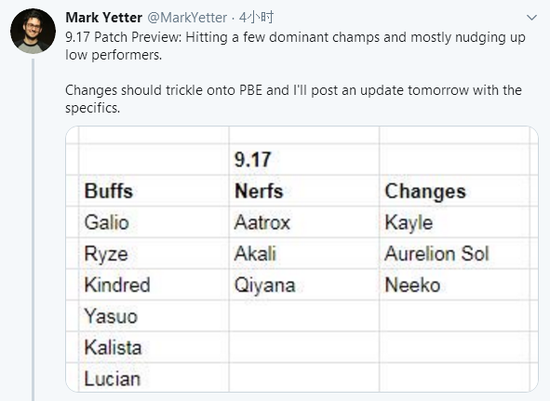 今天,拳头设计师Mark Yetter在个人推特上透露了9.17版本的一些改动情况。