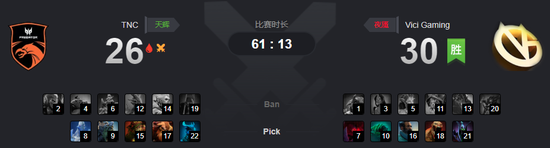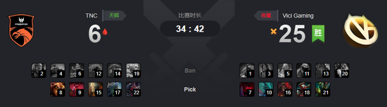 然而在TNC撤退的时候小小TP吃了个小狗的大晕被秒,随后VG进攻,潮汐在中路果断刷新大秒掉了电魂,钢背也被击杀,两人无法买活。VG杀上高地开始入场,TNC只能打出GG。
