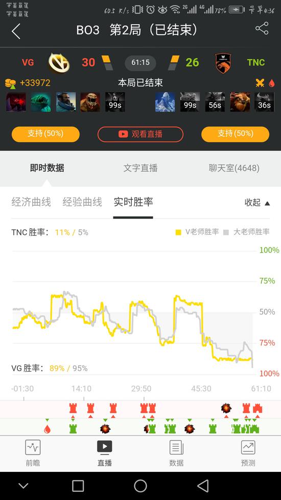 21分钟TNC强行进攻下路,然而VG这边打团根本不虚,潮汐被先手打了一套没死踩出大招,VG一拥而上秒掉钢背,电魂两条命也交了,潮汐到最后都没死,VG只交出一个拉比克赢下了团战的胜利。VG慢慢依靠自己的实力把经济打成了优势。