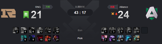Alliance在最后一手ban人时似乎出现了失误,耗光了所有时间没有ban人,然后拿出了飞机,与此同时队内还有虚空和蓝猫两个大哥型英雄,最后他们让飞机打了大哥,中单蓝猫和三号位虚空。而RNG这边则是敌法火猫和亚巴顿三核,搭配老鹿毒狗双酱油。