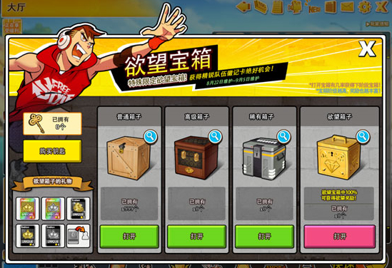 赶快来打开欲望宝箱吧!购买钥匙打开宝箱,打开宝箱有几率获得下阶段的宝箱。宝箱阶级越高奖励也越丰富,有机会获得5星队伍徽记卡。
