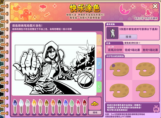 给图片涂上7种颜色并完成彩色图片,每完成一张图片可以获得奖励。完成任务时,调色板中会添加一种颜色。画板填满颜色之后会有给图片涂色的机会。每日有四次涂色机会,选择的颜色不符合的情况下不会上色,会赠送一些小补偿。