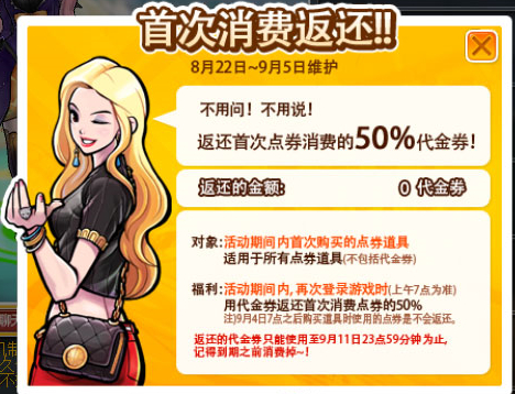 活动期间内首次购买的点券道具(不包含代金券)可以参加该活动,通过代金券返还首次消费点券的50%。9月4日7点之后购买道具时使用的点券不会返还,代金券有效期至9月11日23点59分。