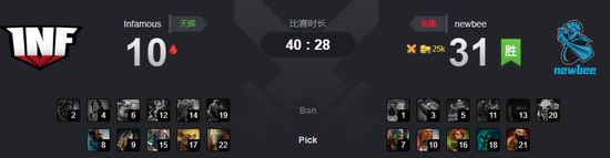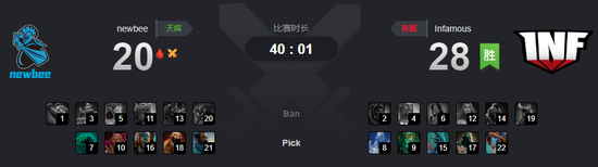 40分钟,最后的一波高地团战,NB也是赢得轻松惬意。团战开始前,黑鸟在INF的高地上直接一个大招秒了小强。残局,剑圣无敌斩的伤害被NB众人平摊,无敌斩结束后,剑圣被羊刀命中。剑圣阵亡,INF守无可守,NB扳回一分。