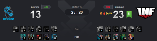 BP阶段,NB点出了YawaR的小狗和CCNC的船长,INF则是拿出了K1的骷髅王和克里斯的中单小鱼人。开局两分半,NB在下路拿到一血。不过,大牛也被INF收掉。中路对线,小鱼人被船长压的很惨。5分钟,试图单杀船长的小鱼人惨遭反杀。不过,INF在对线期结束后倒是发动了两波有效的进攻。在野区打野的船长被老鹿找到,旁边的卡尔也一并阵亡。打出了气势后,只有一个战鼓的小鱼人在NB的野区为非作歹。偷了快30层数的小鱼人先杀大牛后杀卡尔,比赛进入了INF的屠杀节奏。14分钟,NB集合五人之力终于中断了小鱼人的杀戮。