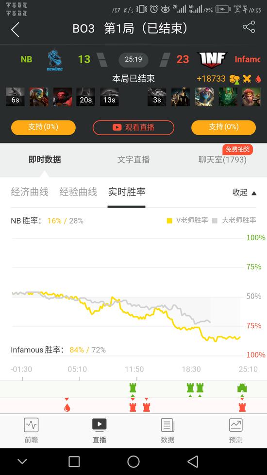 在赛前的预测上,相信很多人都认为Newbee能轻取Infamous,但BP方面Newbee显然没有重视Infamous的绝活,被他们拿到了极其擅长的骷髅王和大圣,V老师和大老师因此给了五五开的胜率,但Infamous从开局就保持着完美节奏,V老师对Infamous的支持力度不断加大,而相对地大老师的预测就显得过于保守了。