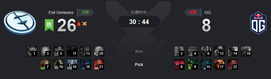 22分钟OG打掉肉山后开始依靠剑圣转+小鹿奶的赖皮上高磨高地,EG似乎毫无办法。25分钟EG三路告破,EG出来最后一搏,刷了一整场的敌法还是没法和经济爆炸的OG相抗衡,EG只能打出GG。