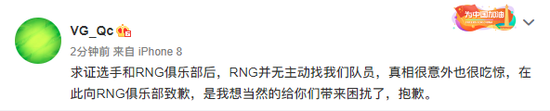 在RNG发布了《澄清公告》后,阿绿又@ 了队内的四号位选手Fade,要求他给大家一个交代。随后阿绿新微博把挖角这个瓜推向了新高潮——原来RNG并没有主动接触VG的选手。