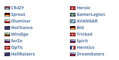欧洲冠军杯的比赛将从9月中旬开打直到11月,比赛的形式将以线上联赛为主,前四名将前往马耳他参加线下决赛并争夺60000美金的总奖金。目前参赛队伍名单如下: