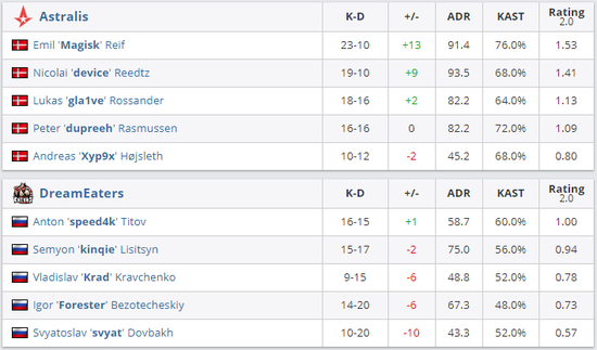 下半场kinqie在上来就被打头的情况下拿到四杀帮助队伍再次拿下手枪局,轻松度过A队的经济局后比分来到9-8。来到长枪局又到了丹麦人的表演时间,全员突破手的Astralis打出一波6-1的小高潮先拿到赛点,第二十五回合svyat上来先打两人也没能止住队伍的颓势,device狙击立马还以双杀配合Magisk的B区突破,最终Astralis以16-9战胜DreamEaters。