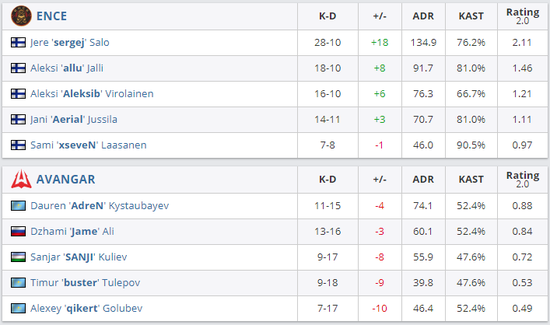 下半场ENCE拿下手枪局后,一路高歌猛进拿到赛点,最终下半场AVANGAR一分未得,ENCE以16-5轻松拿下第一场比赛的胜利,本场sergej拿到28个击杀,rating高达2.11。