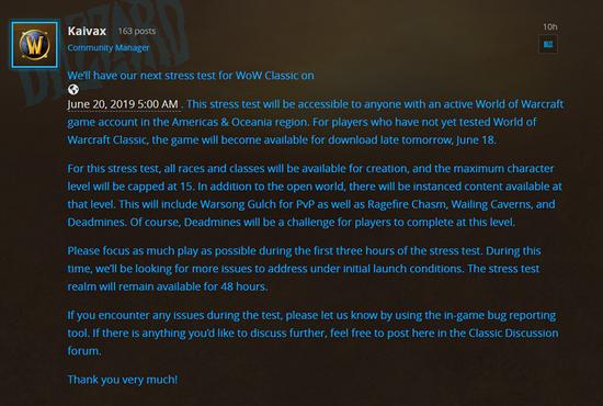 压力测试将于太平洋时间6月19日下午14:00(北京时间6月20日凌晨5:00)开始,向所有拥有美服和大洋洲服活跃账号的玩家开放。尚未参与过怀旧服测试的玩家将可以在明天晚些时候提前下载测试客户端。
