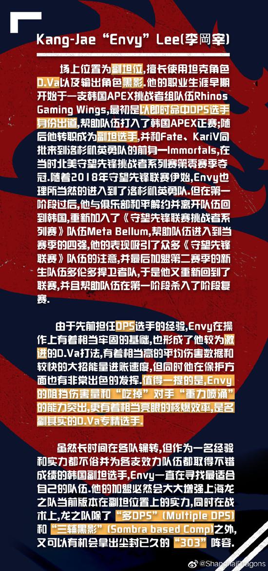 更新:上海龙之队官方发布了 Envy 选手的介绍。