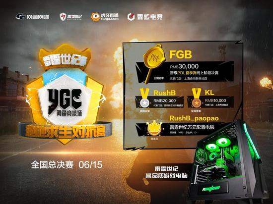 6月15日,雷霆世纪杯网鱼竞技场《绝地求生对抗赛》全国总决赛落下帷幕,PCL分析师灭亡哥5400在虎牙TV全程直播解说。最终,来自上海的FGB战队斩获全国总冠军,捧走3万元冠军奖励,并将代表网鱼竞技场与雷霆世纪参与PDL夏季赛线上决赛!亚军战队RushB队员paopao凭借四场十杀成绩获得“击杀王”称号,斩获雷霆世纪万元配置电脑。