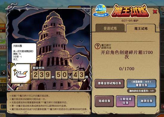 魔王试炼开启后倒计时为240小时,任务难度较大,若第一次放弃试炼任务可以获得8888代金券。第二次再次放弃任务不会再获得代金券。魔王试炼完成一次后,再次收集7个魔王碎片也可获得8888代金券。魔王试炼也可以使用“任务重置券”,但消耗较多。福利商城可以购买“封印契约”,可直接完成魔王试炼。(该道具无法完成普通试炼)魔王任务同普通试炼无法同时开启进行,必须将正在进行中的这一轮普通试炼完成后才可以开启。