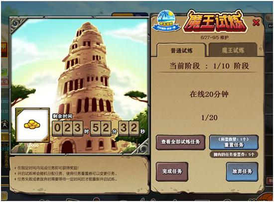 6月27日服务器维护后9月5日服务器维护期间魔王试炼活动将开启,活动以账号为单位进行,分为普通试炼和魔王试炼。 普通试炼共10轮任务,需要每轮完成一个任务,随着任务进度推进,试炼任务难度会增加。魔王试炼为单轮,任务难度较大,请谨慎选择开启!