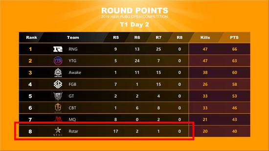 Rstar在最关键的终局之战成功吃鸡,狂拿24分,最终排名第四,成功守住T1资格。