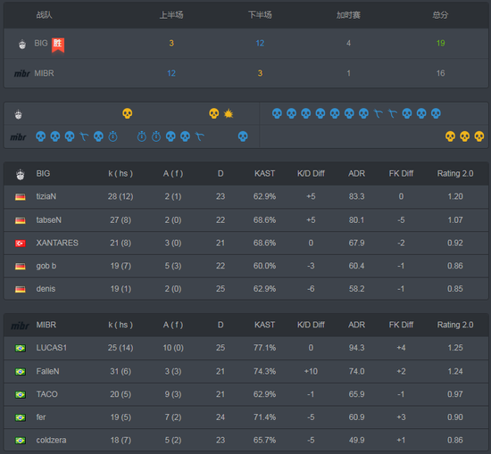 胜者组的形势如此简单易懂,但是在B组的败者组方面,事情就变得很复杂了。首场MIBR打BIG,尽管MIBR近期的状态非常糟糕,可他们似乎也没有沦落到打不过BIG的程度——但就在人们都这么认为时,冷门爆发了!图一是对手挑选的Dust II,MIBR在上半场就表现的特别被动。到了下半场,手感爆发的gob b又是三杀又是四杀,把MIBR打的头晕目眩。好在到了己方选择的Overpass上,MIBR还是用一个16比7彰显了实力。但是在决胜局中,MIBR就未能把自己的优势保持到最后。Train的上半场,MIBR取得了12比3的巨大优势。可在阵容对换后,MIBR却显得十分茫然——他们也不知道该如何进攻。趁着这个机会,BIG打出了一波惊世骇俗的12连胜!从3比12打到15比12,BIG距离胜利只有一步之遥。尽管MIBR在最后时刻重新振作起来,但是在加时阶段,gob b接管了比赛。被BIG淘汰出局,MIBR的状态令人堪忧。