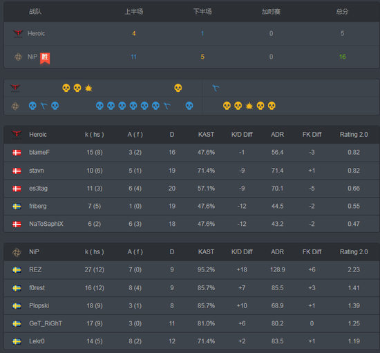 如果说FNC是被A队按在地上摩擦,那么Heroic至少还有过反抗的迹象。图一Overpass,在上半场连丢三分后,瑞典人friberg用一波四杀为队伍挽回了颜面。但好景不长,NIP的新人Plopski很快就以牙还牙——在比分即将被Heroic追平的时候,Plopski在B点水管前连打三人。之后,NIP的得分之旅便不可阻挡。上半场结束时,比分来到了夸张的11比4。下半场的手枪局,纵使blameF的ACE非常亮眼,但对于Heroic来说,这也仅仅是昙花一现。翻盘的势头没有持续多久,Heroic就遭到了来自REZ和friberg的阻击。NIP多次在第二时间转点成功,而Heroic则未能迎头赶上。比分最终定格在16比5,Heroic输的相当憋屈。