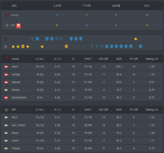 第二张地图的前半段,Heroic在防守上下了一番功夫,取得了三分的优势。但到了Inferno的下半场,只能说还是NIP技高一筹。这一次,他们在拿下手枪局后打出了九连胜的高潮,赢的可谓是轻松惬意。过程中,f0rest曾以一己之力挫败了Heroic的翻盘计划。这个ACE,f0rest的表现非常精彩。在此之后,GeT_RiGhT和REZ也相继发作。前者在A点大坑里连杀四人,让对手感到了彻底的绝望;后者则是用一波三杀帮助NIP拿到赛点。从6比9到16比10,NIP获胜。