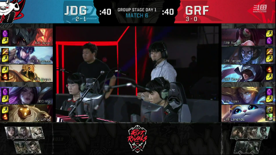 拿到大龙后,GRF迅速多线推进滚起雪球,推掉JDG所有外塔。将经济领先扩大到8K。39分钟,GRF利用大龙引诱JDG前来团战,团灭对方后,为LCK再得一胜。小组赛首日LCK赛区取得全胜战绩。