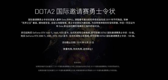 GeForce玩家购买GeForce GTX 1660 TI, 1660,1650 显卡,台式机或笔记本电脑,即可获赠 DOTA2 国际邀请赛勇士令状-50级。