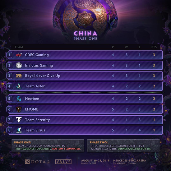 TI9中国区预选赛的第一个比赛日,除了一胜四负的天狼星外,剩下七支战队都打的有来有回。以至于17场BO1全部结束后,出线形势依旧扑朔迷离。目前,RNG、IG和CDEC是盘踞在积分榜前三名的第一集团。紧随其后的,是两胜两负的茶队和Newbee。再之后,则是出线情况比较危险的TS与EHOME。不过,再看了独联体和东南亚的比赛后,我并不想根据首日的结果就把话说的太死——今天濒临淘汰的战队,或许会像NAVI一样,在淘汰赛中大放异彩。