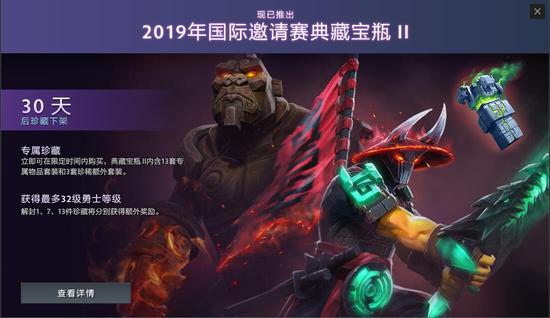 典藏宝瓶 II仅上架三十天,这些专属套装在珍藏下架后将绝版,不过极其珍稀的主宰套装除外,将在明年国际邀请赛结束后的2020年年底可以买卖。作为传统,25%的勇士令状相关销售额将直接进入国际邀请赛总奖金。