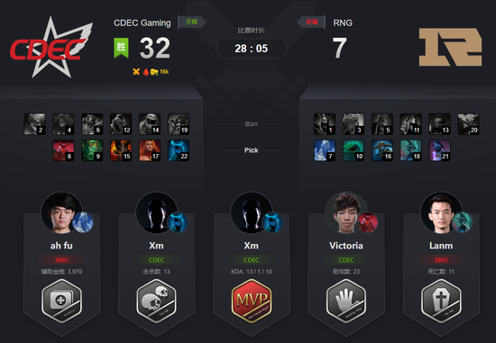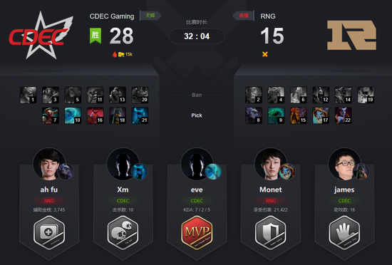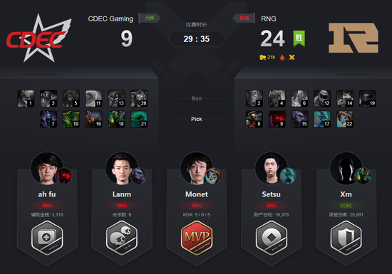 意识到问题的RNG很快就发动了一波开雾奇袭,这一次,CDEC被打了个措手不及,三名英雄在野区排队支付。经济差距来到了八千块,留给CDEC的时间不多了,但拍拍熊的白给却让局势进一步恶化。接下来的时间里,CDEC的反击全部以失败告终,莫奈特的无解肥小鱼人主宰了比赛。29分钟,RNG直接杀入了CDEC的泉水。比赛结束,人头比定格在24比9。