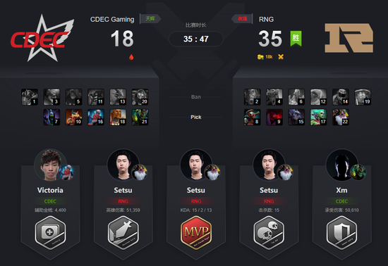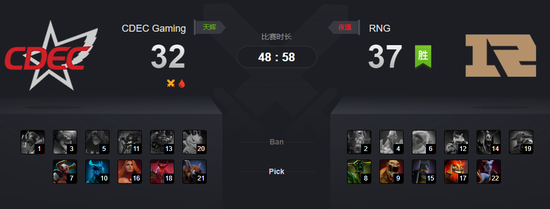 本以为RNG能顺势完成翻盘,但玛尔斯的意外阵亡却让CDEC直接打上了RNG的高地——因祸得福!冲到对面四塔的CDEC为自己的大意付出了极为惨痛的代价。买活、留人、反打,RNG打出了一波零换五的高潮,直接拆掉了CDEC的中路。36分钟,玛尔斯、萨满和女王的三个大招完美命中!零换三,RNG吃人了!又是肉山团战,人马阵亡,RNG轻松带盾。然而,女王却在打完盾后跳入了CDEC的怀抱。没能利用女王的死做任何文章,CDEC绝望地看着RNG杀上了他们的高地。萨满刷新蛇棒,下路沦陷。44分钟,CDEC决定开雾一搏,可惜只秒了尸王。47分钟的大决战,RNG赢的轻松惬意,还逼出了CDEC的所有买活!一分钟后,拍拍熊的阵亡为CDEC敲响丧钟!