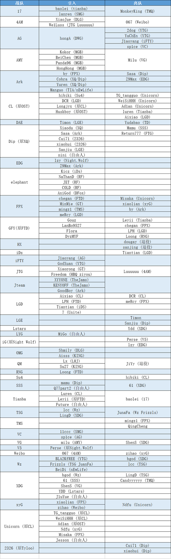 2、选手转会情况