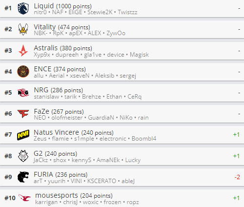而Liquid战队则依旧以1000点积分稳坐第一,排名第二的Vitality又一次不敌Liquid,积分仅仅有474分。而Astralis则位列第三,不知他们能否打破Liquid的奇迹。