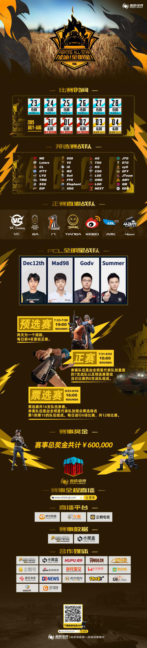为助力PCL赛区出征全明星,蜘蛛电竞将在7月23日正式启动“加油!全明星!”赛事。比赛时间为7月23日-8月4日,共分为预选赛、正赛和票选赛三个阶段,本次比赛总奖金高达六十万元!