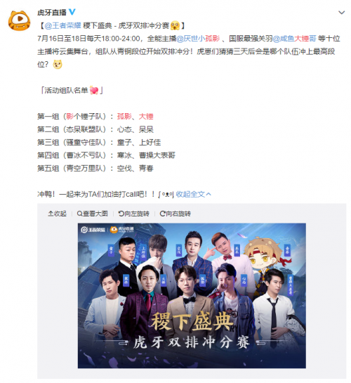 虎牙直播官博发布了一张稷下盛典活动海报,比赛内容是双人组队从青铜段位开始的冲分,三天后冲上最高段位的组合获胜。海报由孤影占C位,并且只@了两位主播,一个是全能主播@厌世小孤影,另一个是国服最强关羽@咸鱼大锤。两人组成“影个锤子队”参加该活动。