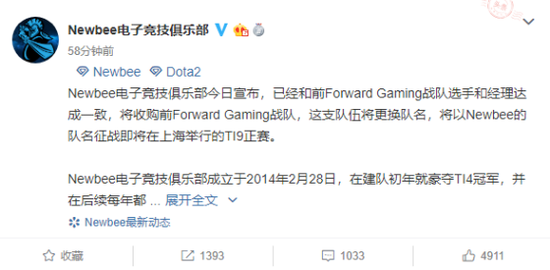 前不久Forward Gaming宣布队伍因为公司经济原因成为自由队员以后,我们迅速联系了这5位队员、教练和经理,感谢队员、教练和经理对Newbee电子竞技俱乐部的信任,我们在短暂的协商后迅速达成一致,将对Forward Gaming进行收购,并将队伍名字更换为Newbee,他们也将代表Newbee征战在8月15日-25日在上海举行的TI9正赛,希望他们能继续为Newbee带来荣誉。