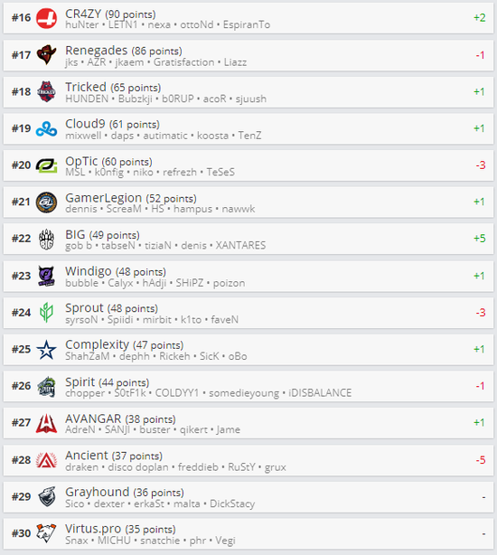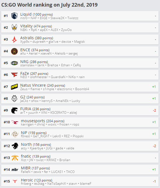 随着IEM芝加哥站和Minor欧洲和美洲赛区的结束,HLTV.org也更新了最新一期的战队积分排名榜。在这份榜单上,战队的总体排名变化不大,刚刚在芝加哥获冠军的Team Liquid再次牢牢地占据着世界第一的宝座,排名第二到五位的分别是Vitality,Astralis,ENCE以及NRG,这个排名和上周与变化并无差别。Mousesports则凭借着在欧洲区Minor上发挥前进一位,挤进前十。