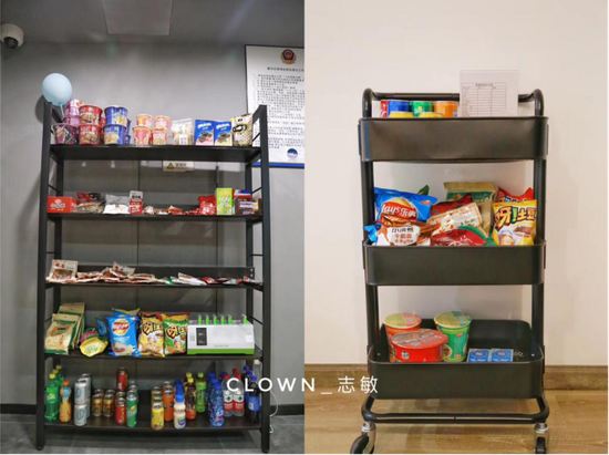 零食架子,泡面、薯片、辣条、饮料.....太对吃货们的心了!