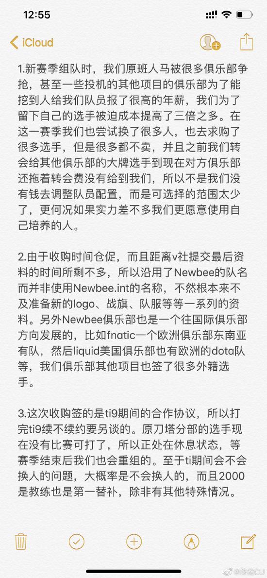 今天凌晨,Newbee的老板佟鑫就在微博上针对一些问题做出了答复。