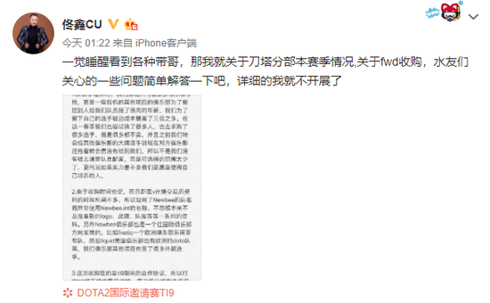 TI9在中国举办,对于中国俱乐部来说肯定是一个非常重要的大赛,除了高额奖金之外,在官方层面以及大众层面都能带来极好的推广效果,既然FWD自己财政危机解散了,那么Newbee收购他们也无可厚非。不过佟鑫上面微博中提到的“欠转会费”的俱乐部具体指谁,还是很让人在意的。