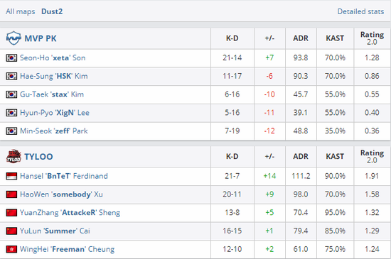来到首张地图Dust2上先执进攻的TYLOO多人控制中路,不料正巧遇到B区前顶的MVP三人,一波混战后TYLOO仅掉一人就拿下了手枪局。有惊无险接下对手的强起局后,掏出长枪的MVP开始多人抱团先抢A大后重B点。慢攻的TYLOO碰巧踏入包围圈惨遭刷光,此时仅剩单走中路的somebody不慌不忙,先打掉窗口后断死警家CT。但看其而后预瞄可以猜到队内出现交流失误,并未告诉他车位的zeff还在包点。