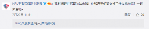 孤影不仅做好所有的后勤工作,还给解说和选手们加油打气,最后还不忘给观众们安利一波王者荣耀世界冠军杯。得到孤影鼓励的参赛者发微博和他互动,就连官方都站出来表示自己没请错人,由此可见,孤影这个观赛大使做得十分合格。