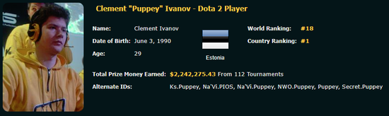 当然,在现役选手中,KKY参与职业赛事的数量还并非第一,比如说KKY的老队友Puppey,就已经参与了112项职业赛事,但是由于Puppey获得TI冠军“太早”,他的比赛奖金数并没有KKY高。