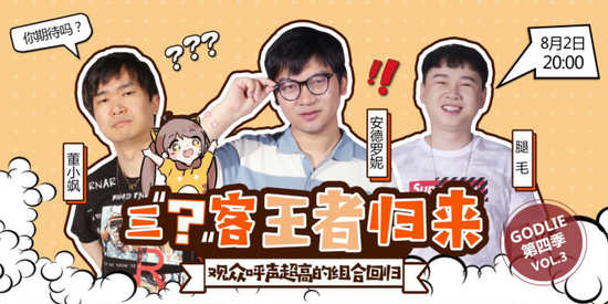 俗话说“三个男人一台戏。”当董小飒、安德罗妮、腿毛再次齐聚《Godlie》现场,加上第四季的唐风主题和专属游戏版型,相信这第三期节目不会令人失望。8月2日虎牙直播间660200,共同锁定第三期虎牙《Godlie》!