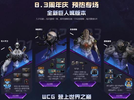 首先来大致看下都有哪些奖励,限时10倍经验;8.3周年庆预约免费领四大天王奖励;巨人城版本每天一局领礼包;WCG夺冠累积游戏好礼;生化加油站签到奖励,以及幸运大抽奖等。