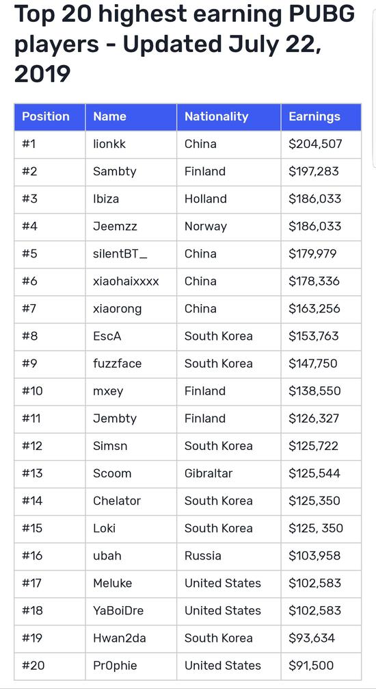 近日,有网友统计并制作了迄今为止PUBG职业选手奖金收入排行榜。