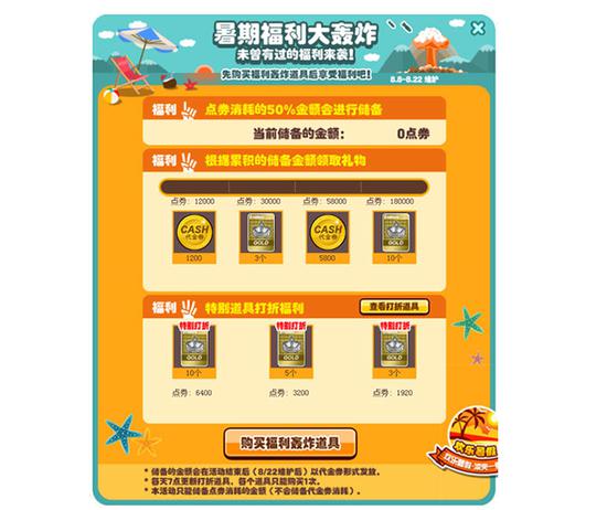 8月8日服务器维护后—8月22日服务器维护前,参与活动需要购买道具“福利轰炸”(无法使用代金券购买)。点券消耗的50%会进行储备,根据储备的金额可以领取礼物。购买道具“福利轰炸”后,每天可以购买特别打折道具。储备的金额会在活动结束后以代金券形式返利。每天上午7点更新打折道具,每个打折道具限买一次。本次活动只能储备点券金额,不储备代金券消费。